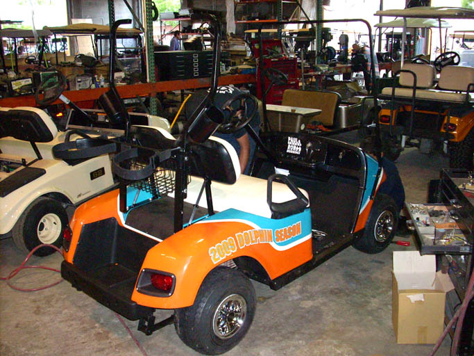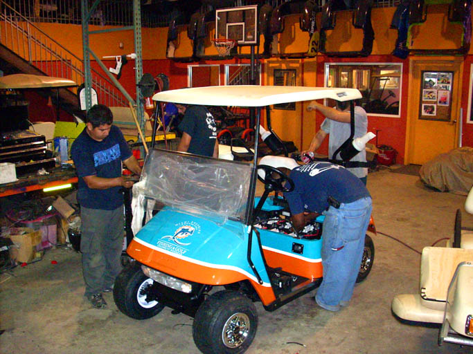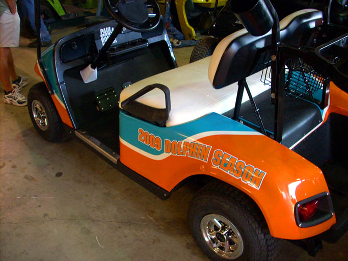 This beautiful cart was auctioned off for charity on June 6th 2009. It was custom built for the Miami Dolphin Foundation and was signed by the entire Miami Dolphins Football Team at the Miami Dolphins Golf and Fishing Tournament. See Event Pictures Below See Custom Build Pictures Below. |